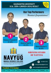સૌરાષ્ટ્ર યુનિવર્સિટીના તાજેતરમાં જાહેર થયેલ B.Sc. Sem 4 ના રિઝલ્ટમાં નવયુગ મહિલા સાયન્સ કોલેજની વિદ્યાર્થિનીઓએ જિલ્લામાં Top-3 માટે ટોચનું સ્થાન જાળવી રાખ્યું છે.