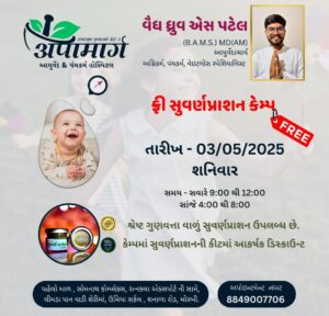 આ પુષ્ય નક્ષત્ર નિમિતે એટલે કે તારીખ 03/05/2025 ને શનિવારે ફ્રી સુવર્ણપ્રાશન કેમ્પ