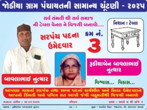 જોડીયા ગ્રામ પંચાયત ની સરપંચ ની ચુંટણી વર્ષ=૨૦૨૫ ના નવા સરપંચ તરીખે આજ રોજ મતગણતરી હાથ ધરવામાં આવી હતી.તેમાં જોડિયા મુસ્લિમ સમાજ ના મહિલા શ્રી મતિ રૂકિયાબેન બાવલાભાઈ નુત્યાર નો ભવ્ય વિજય થયો હતો.સમાજ ના સાથ સહકાર અને ગ્રામજનોના સહકાર થી વિજય મેળવ્યો છે.અને આ જ સાથ સહકાર થી ગામનો વિકાસ માટે આગળ વધશું…………………….