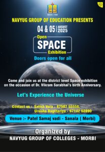 મોરબીની નામાંકીત કૉલેજ નવયુગ ગ્રુપ ઓફ એજ્યુકેશનના પ્રેસિડેન્ટ શ્રી પી. ડી.કાંજીયાસરની પ્રેરણાથી સ્પેસમેન અને મહાન વૈજ્ઞાનિક ડૉ.વિક્રમ સારાભાઇની 106મી જન્મજયંતી નિમિત્તે તારીખ:- 4 & 5 August 2025 ના રોજ ભવ્ય સ્પેસ એક્સીબિશનનું આયોજન કરેલ છે.