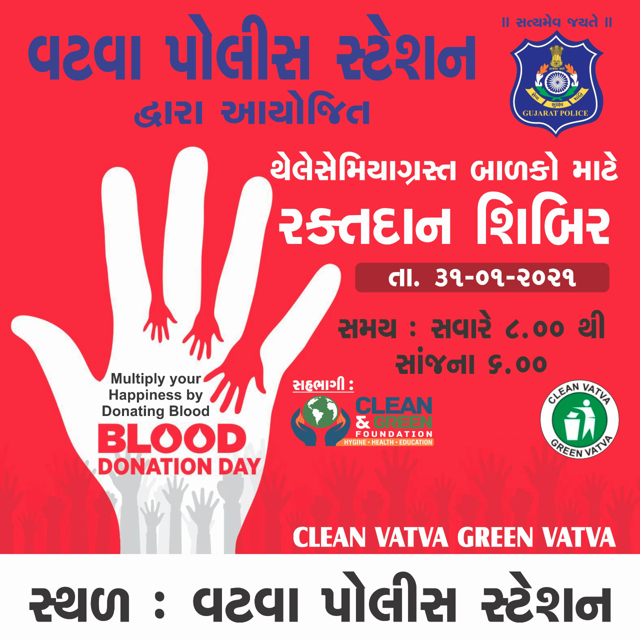 અમદાવાદ ખાતે તાજેતરમાં જ તારીખ 31 1 2001 ને રવિવારના રોજ વટવા પોલીસ સ્ટેશન ખાતે થેલેસીમિયા ગ્રસ્ત બાળકો માટે રક્તદાન શિબિરનું આયોજન કરવામાં આવ્યું હતું હાલ કોરોનાવાયરસ અંતર્ગત સાવચેતીના ભાગરૂપે સોશિયલ ડિસ્ટન્સ સાથે સરકારશ્રીની ગાઈડલાઈન્સ અનુસાર બ્લડ કેમ્પ સફળ બનાવવામાં આવ્યો હતો જેમાં અમદાવાદ શહેર પોલીસ સ્વેચ્છિક રકતદાન કેમ્પનું થેલેસેમિયા ગ્રસ્ત બાળકો માટે રકતદાન કેમ્પનું આયોજન વાંચવા પોલીસ મથકે કરાયું હતું જેમાં સવારે આઠથી સાંજના છ વાગ્યા સુધીમાં સર્વે સમાજના અગ્રણીઓ આગેવાનો યુવાનોએ સહિત પોલીસ કર્મચારીઓએ રકતદાન કરી ખરા પ્રજાના રક્ષક તરીકેની ઓળખ પૂરી પાડી હતી રક્તદાતાઓને સન્માન પત્ર આપવામાં આવ્યું હતું જે સમગ્ર તસવીરમાં નજરે પડે છે